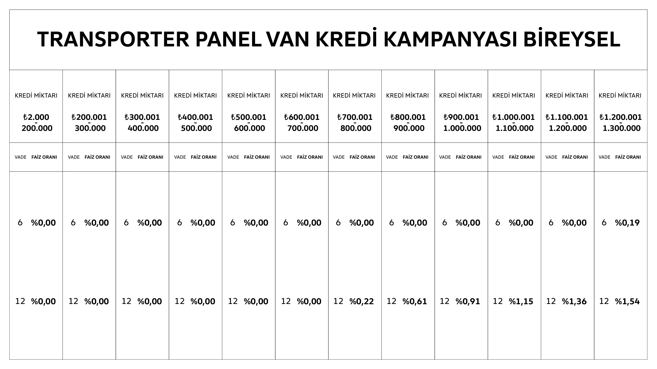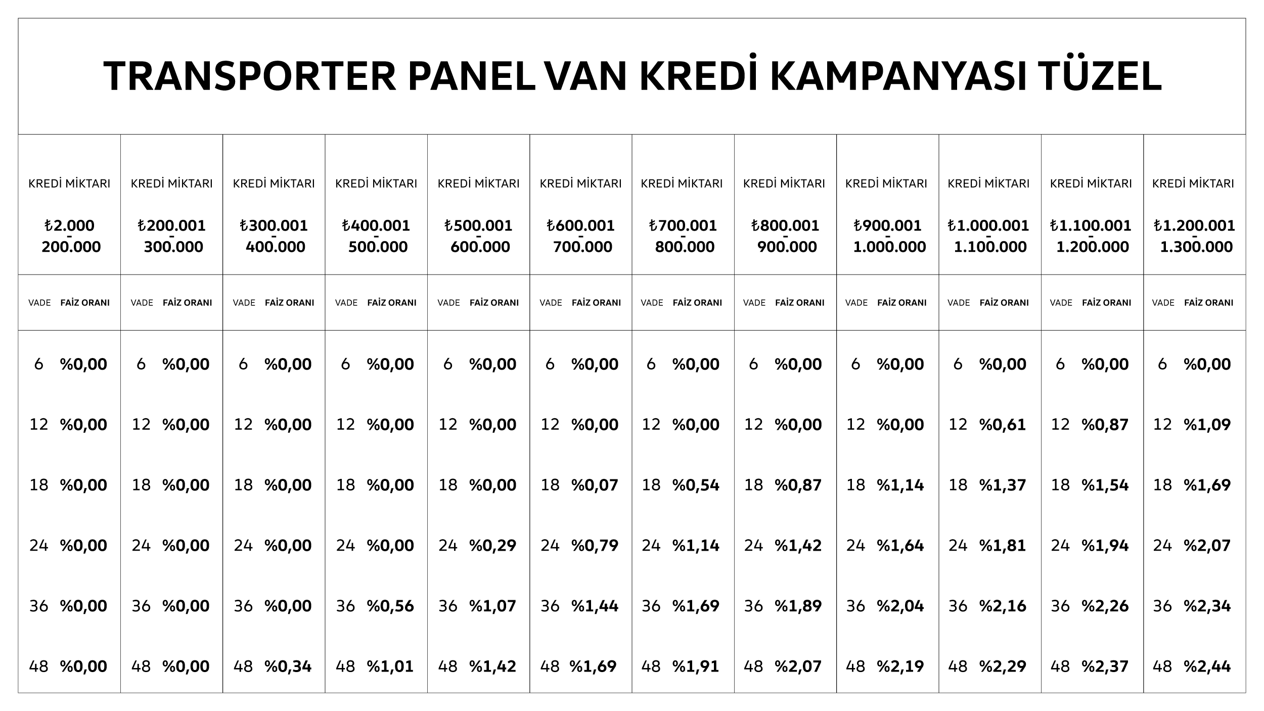 Kampanya tüzel ve bireysel başvurularda Volkswagen 2025 model Transporter Panel Van model araçlar için geçerlidir. Kredi üst limiti Transporter için 1.300.000 TL'dir. Vade 6-48 ay olarak uygulanmaktadır. Kampanya 31.12.2025 tarihine kadar geçerli olup kullanılacak faiz oranları tablo içerisinde belirtilmiştir.